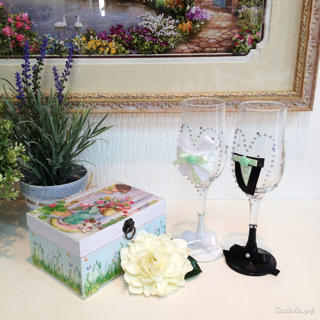 На фото: шкатулка в технике декупаж, заколка-цветок из фоамирана, свадебные бокалы