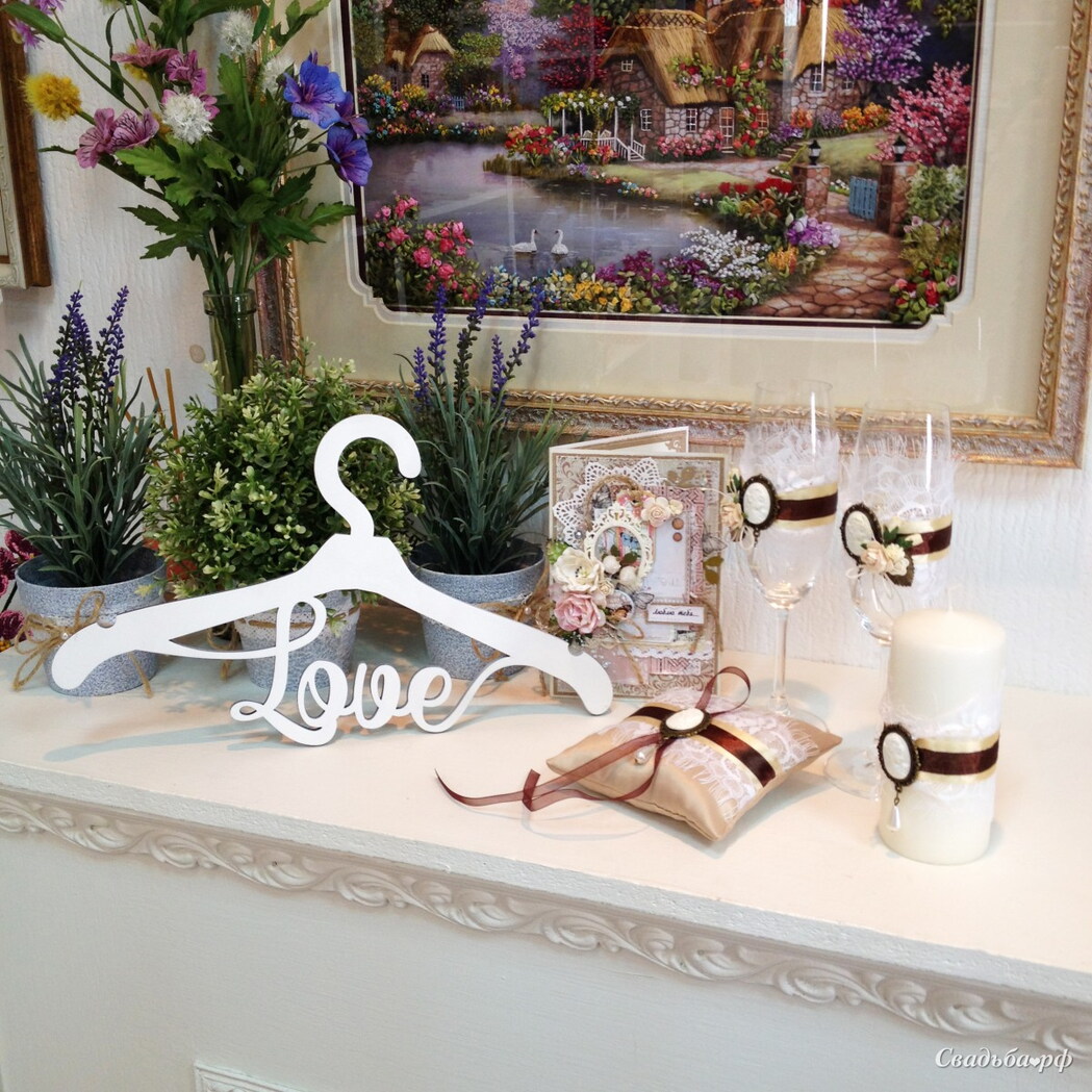 На фото: декоративные плечики «Love», авторская открытка, свадебный комплект (бокалы, свеча, подушечка для колец)
