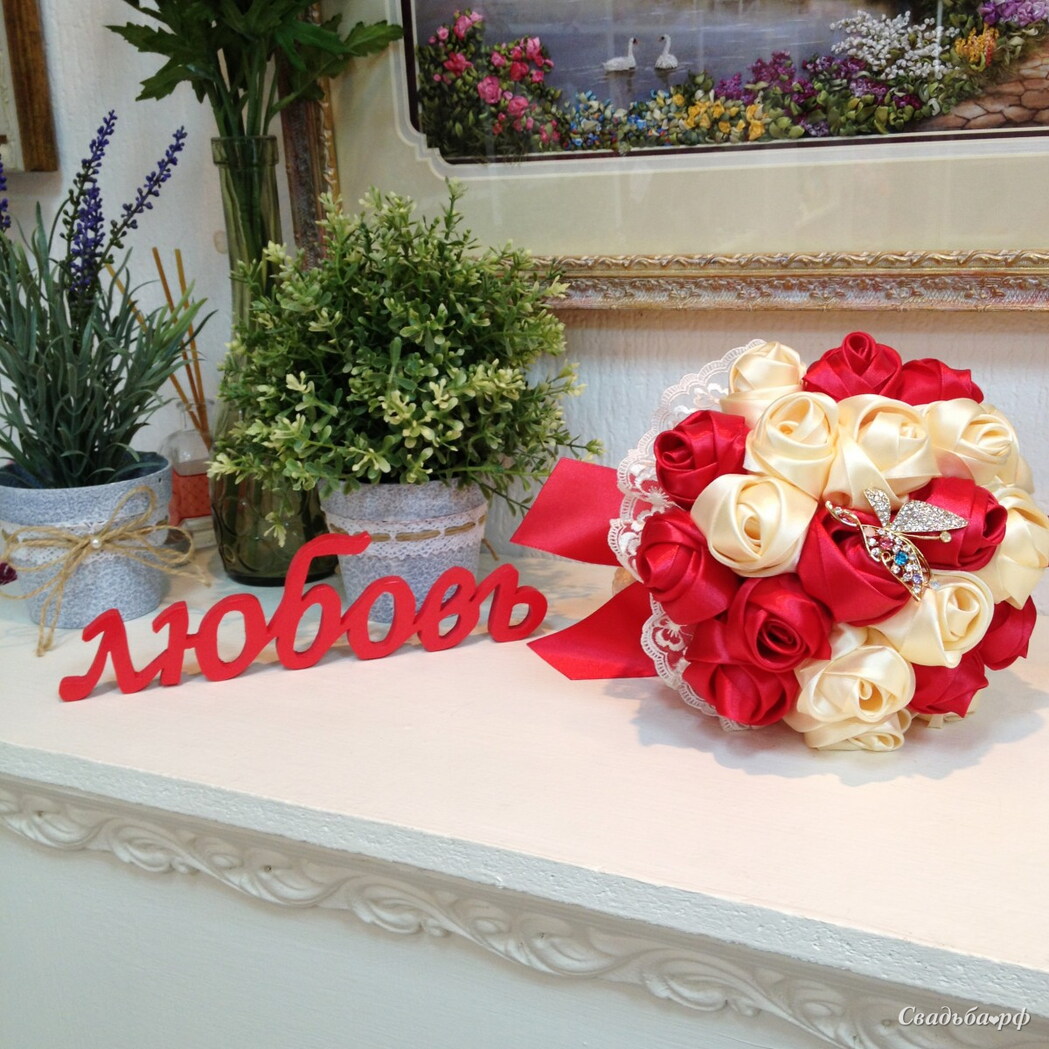 На фото: деревянная надпись «Любовь», букет невесты из атласных лент.