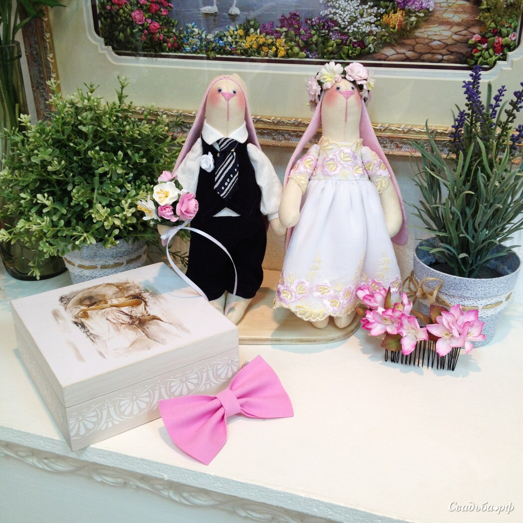 На фото: парочка заек - отличный памятный подарок молодоженам, шкатулка в технике декупаж, галстук-бабочка - модный аксессуар для жениха и его друзей, гребень с цветами из фоамирана.