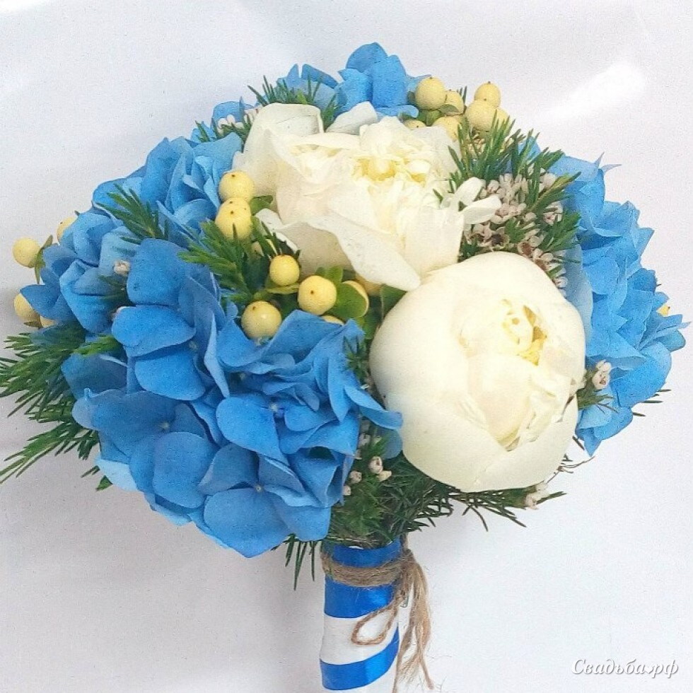 Букет "Голубые грезы" воздушный как облачко среди голубого неба, идеален для тематических бело-голубых или свадеб с морской тематикой.