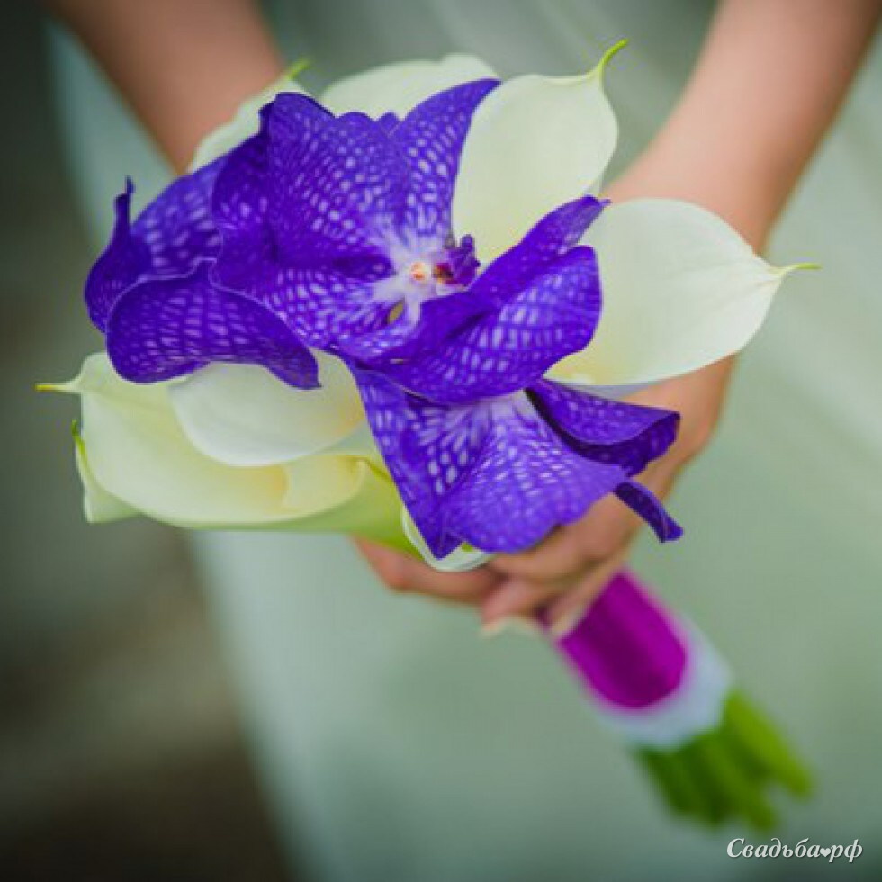 Букет невесты из белых калл и орхидеи Ванда, необычный и яркий, не многие из ваших знакомых с первого взгляда смогут определить что именно за цветы в вашем букете. Удивляйте всех, в конце концов - это ваша свадьба!