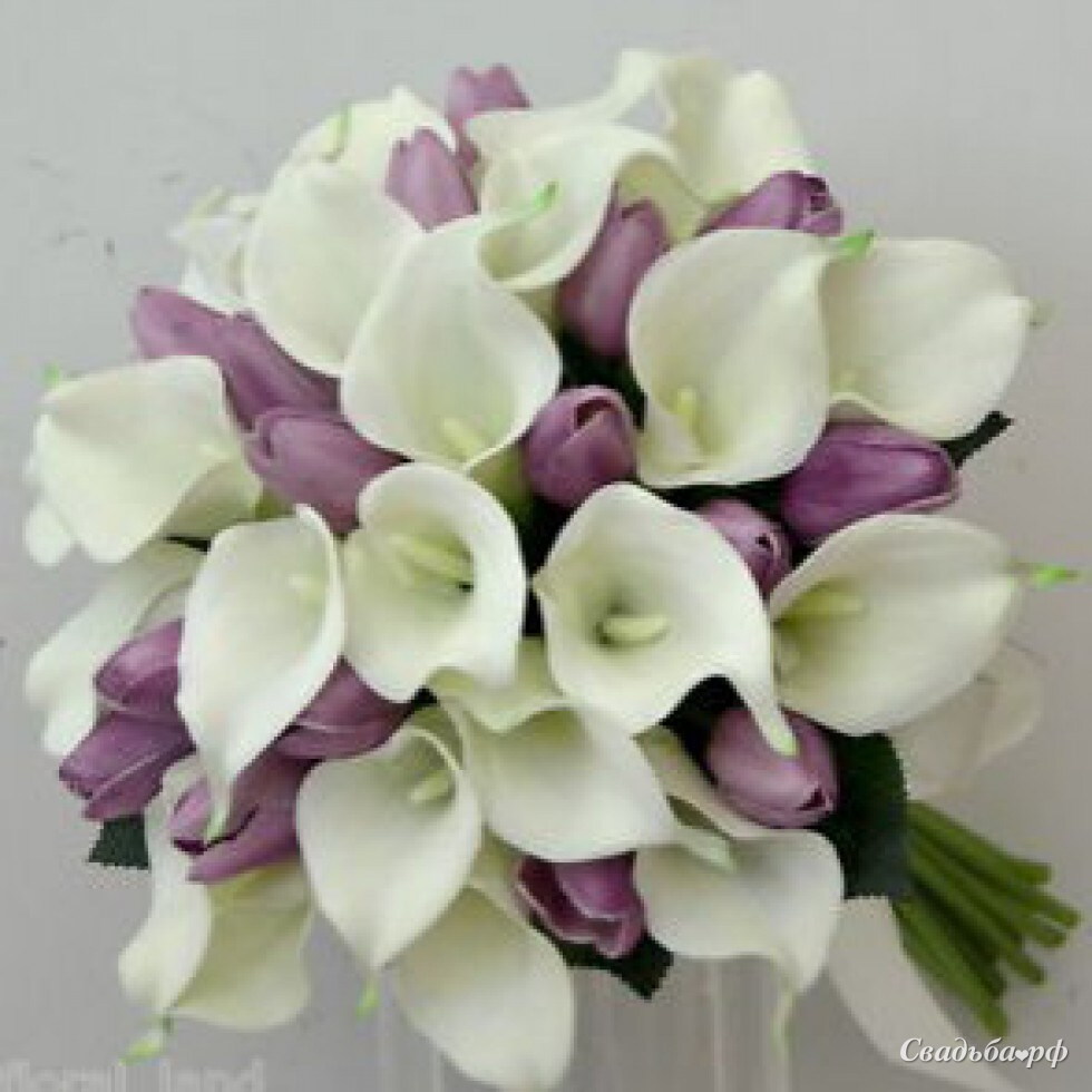 Невероятный букет из 20 миниатюрных белоснежных калл, и 17 сиреневых тюльпанов сорта Милка, вы с таким букетом на своей свадьбе будете ослепительны.