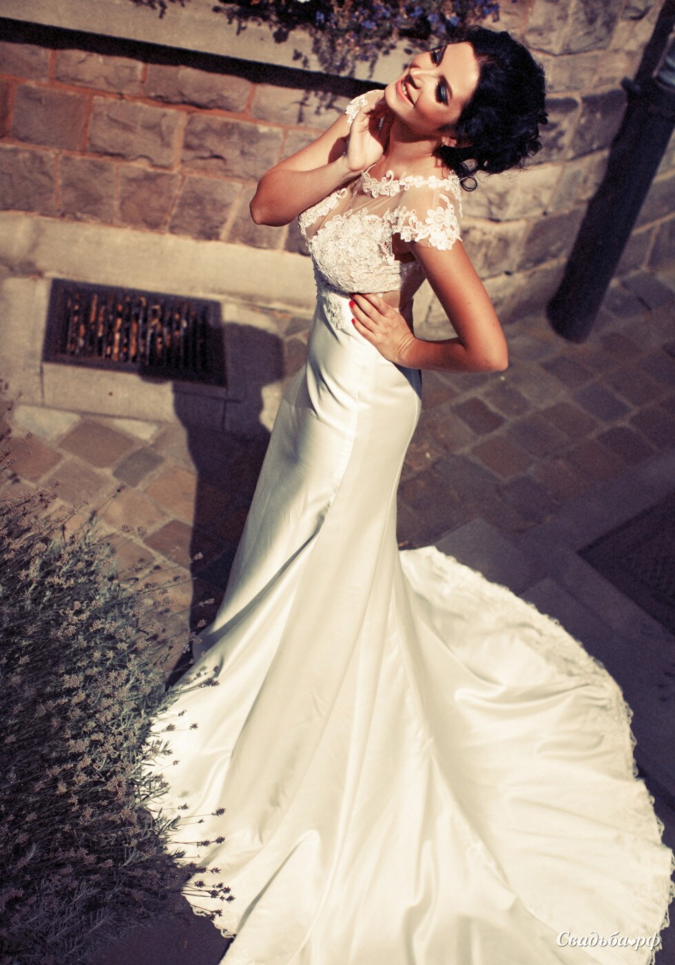 Идеальное, элегантное свадебное платье! Силуэт платья подчеркивает красивые изгибы фигуры. Корсет с прозрачными вставками декорирован кружевом. Низ юбки также декорирован кружевом. Минимум декора, роскошь в простоте и элегантности!